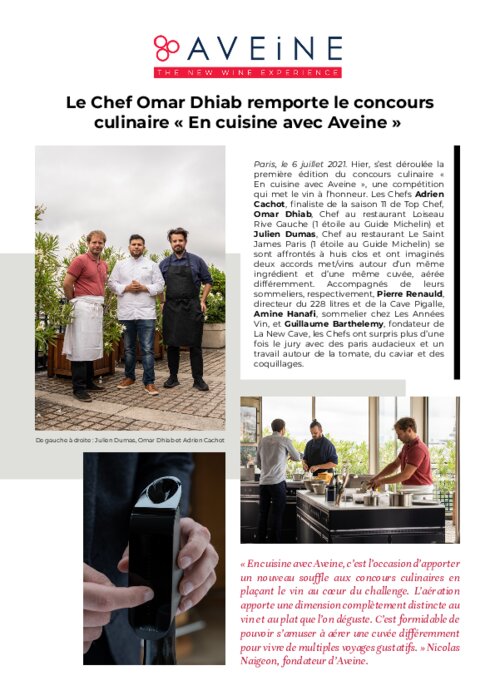 Métiers 06 juillet 2021 - 16:19 Le 5 juillet dernier s’est déroulée la première édition du concours culinaire «En cuisine avec Aveine », une compétition qui met le vin à l’honneur. PDF (1 Mo) Télécharger
