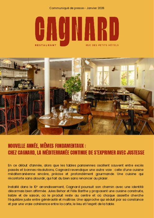 En ce début d'année, alors que les tables parisiennes oscillent souvent entre excès passés et bonnes résolutions, Cagnard revendique une autre voie : celle d'une cuisine méditerranéenne sincère, précise et profondément gourmande. Une cuisine qui réconforte sans alourdir, qui fait du bien sans renoncer au plaisir.
