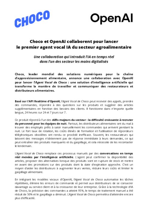 Choco, leader mondial des solutions numériques pour la chaîne d'approvisionnement alimentaire, annonce une collaboration avec OpenAI pour lancer l’Agent Vocal de Choco : une solution d’intelligence artificielle qui transforme la manière de travailler et communiquer des restaurateurs et distributeurs alimentaires.