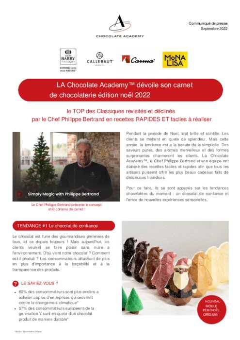 Fournisseurs 13 septembre 2022 - 10:38 La Chocolate Academy, le Chef Philippe Bertrand et son équipe ont élaboré des recettes faciles et rapides afin que tous les artisans puissent offrir les plus beaux cadeaux faits de délicieuses friandises. PDF (624 Ko) Télécharger