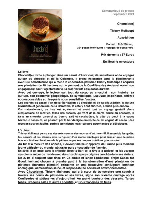 Le nouveau livre de Thierry Mulhaupt, Chocolat(e), prend naissance dans la passionnante aventure colombienne qui a mené en 2019 le pâtissier-chocolatier à acquérir une plantation de 10 hectares sur le piémont de la Cordillère des Andes et nourri son engagement pour l'agroforesterie, la biodiversité et le cacao durable.