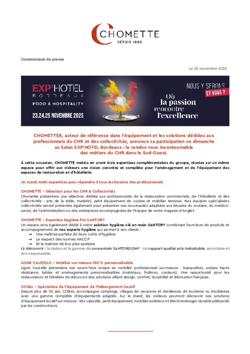 Chomette présentera une sélection dédiée aux professionnels de la restauration commerciale, de l’hôtellerie et des collectivités : arts de la table, matériel, petit équipement de cuisine et mobilier terrasse. Nos équipes spécialisées collectivités seront présentes également pour présenter nos nouveautés adaptées aux besoins du scolaire, du médicosocial, de l’administration ou des entreprises accompagnées de l’équipe de notre magasin d’Anglet.