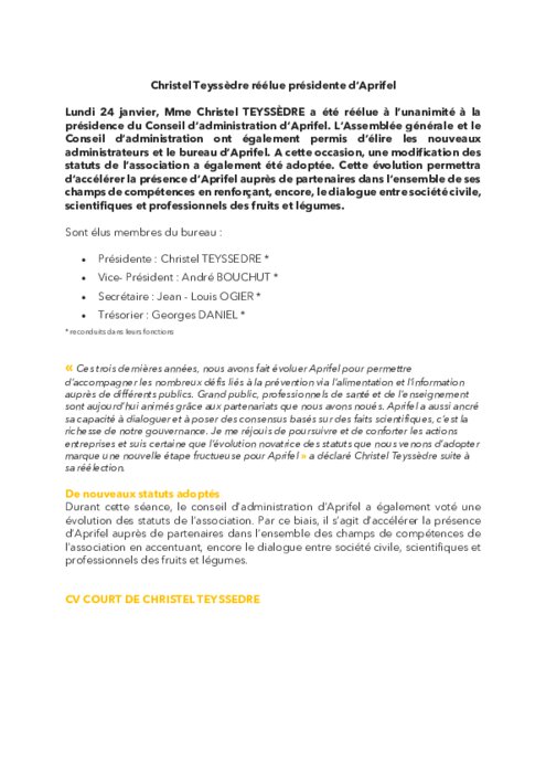 Métiers 25 janvier 2022 - 14:26 Mme Christel TEYSSÈDRE a été réélue à l’unanimité à la présidence du Conseil d’administration d’Aprifel. L’Assemblée générale et le Conseil d’administration ont également permis d’élire les nouveaux administrateurs et le bureau d’Aprifel. PDF (85 Ko) Télécharger