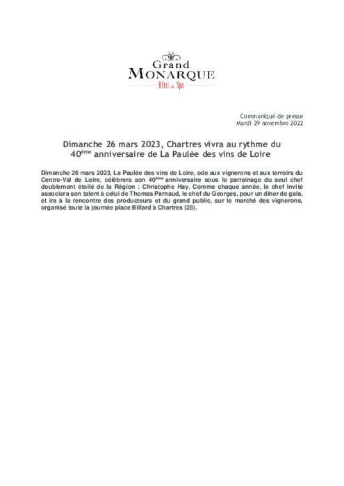 Comme chaque année, le chef invité associera son talent à celui de Thomas Parnaud, le chef du Georges, pour un dîner de gala, et ira à la rencontre des producteurs et du grand public, sur le marché des vignerons, organisé toute la journée place Billard à Chartres (28).