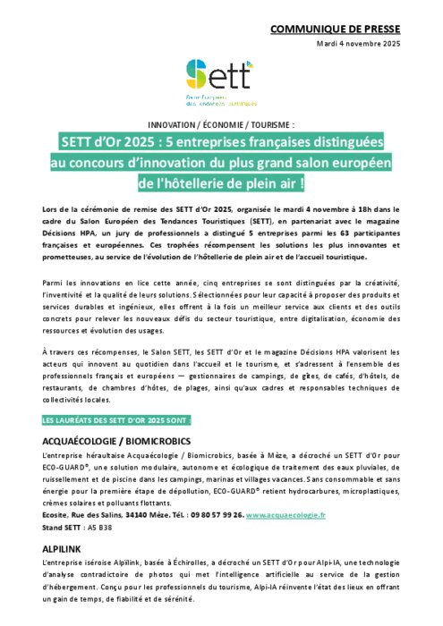 Lors de la cérémonie de remise des SETT d’Or 2025, organisée le mardi 4 novembre à 18h dans le cadre du Salon Européen des Tendances Touristiques (SETT), en partenariat avec le magazine Décisions HPA, un jury de professionnels a distingué 5 entreprises parmi les 63 participantes françaises et européennes. Ces trophées récompensent les solutions les plus innovantes et prometteuses, au service de l’évolution de l’hôtellerie de plein air et de l’accueil touristique.