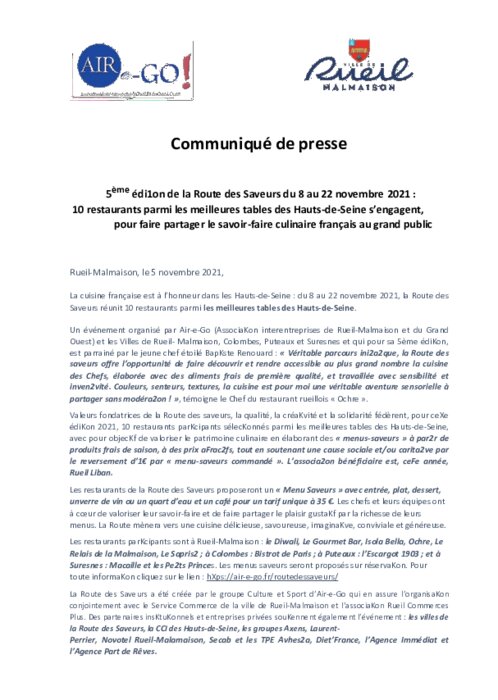 Un événement organisé par Air e-Go(Association interentreprises de Rueil-Malmaison et du Grand Ouest) et les Villes de Rueil-Malmaison, Colombes, Puteaux et Suresnes et qui pour sa 5ème édition, est parrainé par le jeune chef étoilé Baptiste Renouard.