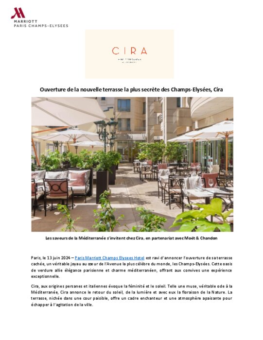 Paris Marriott Champs Elysees Hotel est ravi d’annoncer l’ouverture de sa terrasse cachée, un véritable joyau au cœur de l’Avenue la plus célèbre du monde, les Champs-Elysées. Cette oasis de verdure allie élégance parisienne et charme méditerranéen, offrant aux convives une expérience exceptionnelle.