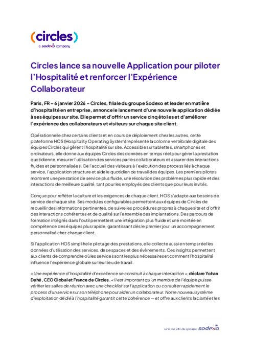 Opérationnelle chez certains clients et en cours de déploiement chez les autres, cette plateforme HOS (Hospitality Operating System) représente la colonne vertébrale digitale des équipes Circles qui gèrent l’hospitalité sur site. Accessible sur tablettes, smartphones et ordinateurs, elle donne aux équipes Circles des données en temps réel pour gérer la prestation quotidienne, mesurer l’utilisation des services par les collaborateurs et assurer des interactions fluides et personnalisées. De l’accueil des visiteurs à l’exécution des process liés à chaque service, l’application structure et aide le quotidien de travail des équipes. Les premiers pilotes montrent une prestation de service plus fluide, une résolution des problèmes plus rapide et des interactions de meilleure qualité, tant pour les employés des clients que pour leurs invités.