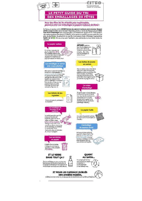 Métiers 26 octobre 2021 - 11:30 Citeo, entreprise à mission chargée du tri et recyclage des déchets ménagers, dévoile son guide du tri des emballages de fêtes . PDF (396 Ko) Télécharger