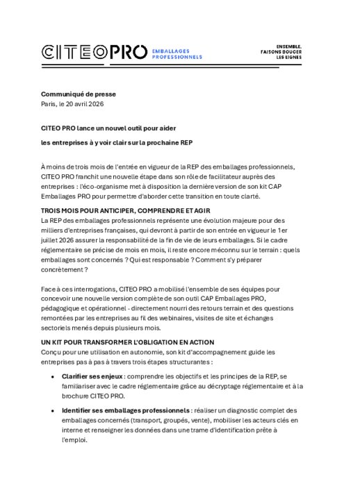 A moins de trois mois de l'entrée en vigueur de la REP des emballages professionnels, Citeo Pro franchit une nouvelle étape dans son rôle de facilitateur auprès des entreprises : l'éco-organisme met à disposition la dernière version de son kit CAP Emballages Pro pour permettre d'aborder cette transition en toute clarté.