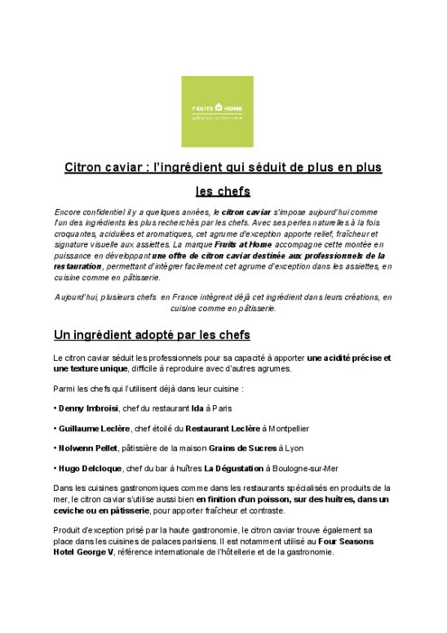 Encore confidentiel il y a quelques années, le citron caviar s’impose aujourd’hui comme l’un des ingrédients les plus recherchés par les chefs. Avec ses perles naturelles à la fois croquantes, acidulées et aromatiques, cet agrume d’exception apporte relief, fraîcheur et signature visuelle aux assiettes. La marque Fruits at Home accompagne cette montée en puissance en développant une offre de citron caviar destinée aux professionnels de la restauration, permettant d’intégrer facilement cet agrume d’exception dans les assiettes, en cuisine comme en pâtisserie.