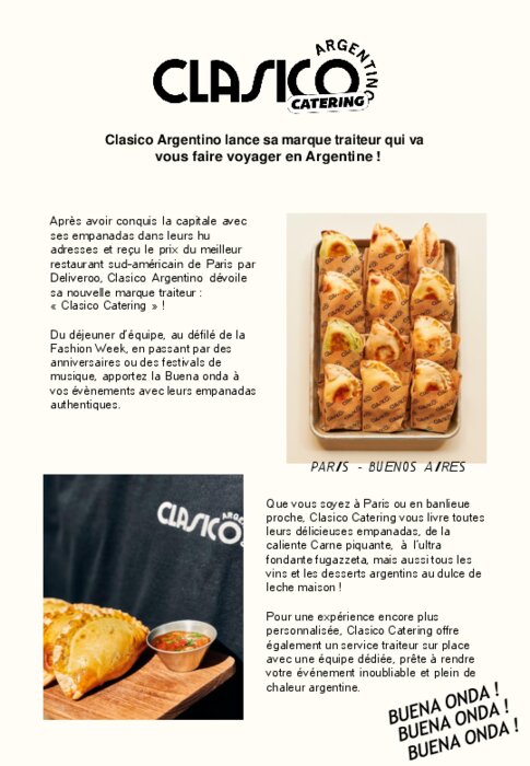Après avoir conquis la capitale avec ses empanadas dans leurs adresses et reçu le prix du meilleur restaurant sud-américain de Paris par Deliveroo, Clasico Argentino dévoile sa nouvelle marque traiteur : « Clasico Catering » ! Pour une expérience encore plus personnalisée, Clasico Catering offre également un service traiteur sur place avec une équipe dédiée, prête à rendre votre événement inoubliable et plein de chaleur argentine.