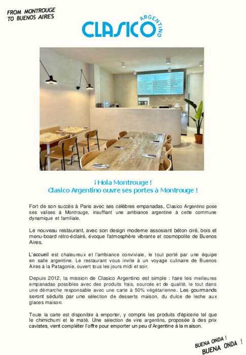 Fort de son succès à Paris avec ses célèbres empanadas, Clasico Argentino pose ses valises à Montrouge, insufflant une ambiance argentine à cette commune dynamique et familiale. Le nouveau restaurant, avec son design moderne associant béton ciré, bois et menu-board rétro-éclairé, évoque l'atmosphère vibrante et cosmopolite de Buenos Aires.