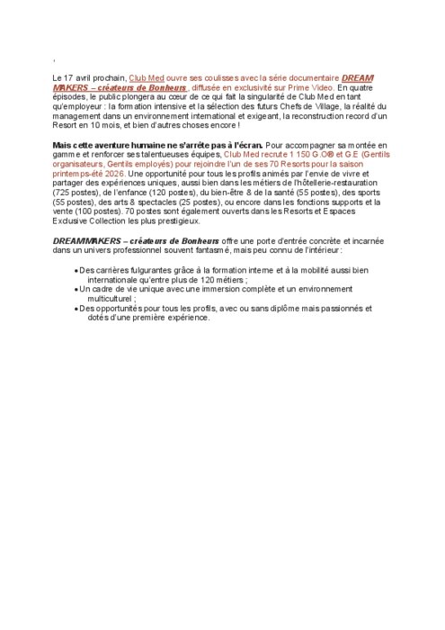 Le 17 avril prochain, Club Med ouvre ses coulisses avec la série documentaire Dream Makers – créateurs de Bonheurs, diffusée en exclusivité sur Prime Video. En quatre épisodes, le public plongera au cœur de ce qui fait la singularité de Club Med en tant qu’employeur : la formation intensive et la sélection des futurs Chefs de Village, la réalité du management dans un environnement international et exigeant, la reconstruction record d’un Resort en 10 mois, et bien d’autres choses encore !