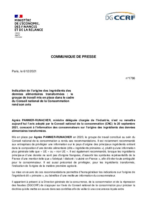 Métiers 06 décembre 2021 - 19:21 La mise en œuvre de ces recommandations permettra d’homogénéiser les indications sur l’origine de l’ingrédient dit « primaire », au bénéfice d’une meilleure information du consommateur. PDF (195 Ko) Télécharger