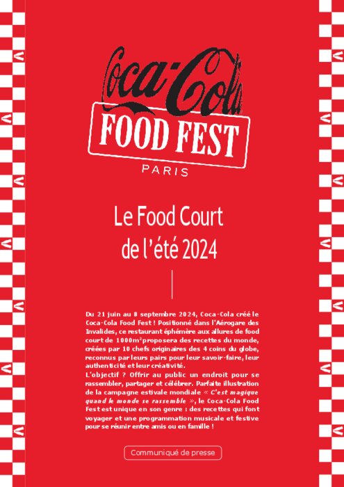 Du 21 juin au 8 septembre , Coca-Cola créé le Coca-Cola Food Fest ! Positionné dans l’Aérogare des Invalides, ce restaurant éphémère aux allures de food court de 1000m² proposera des recettes du monde, créées par 10 chefs originaires des 4 coins du globe, reconnus par leurs pairs pour leur savoir-faire, leur authenticité et leur créativité.