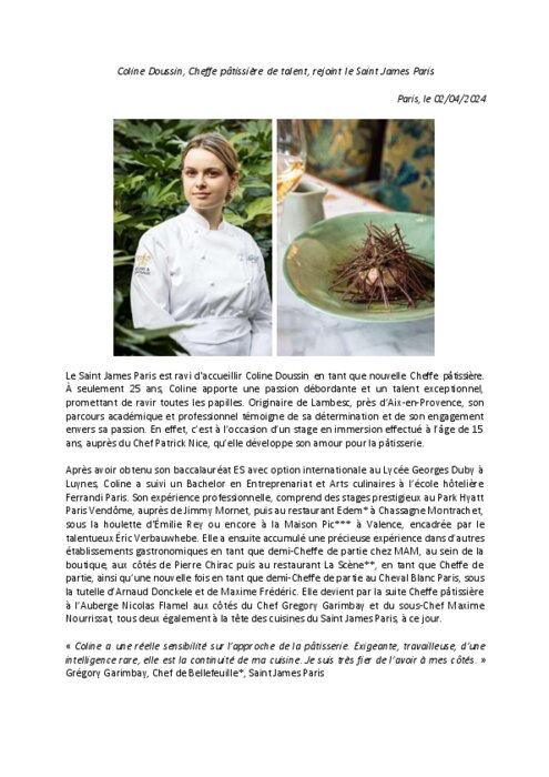 Le Saint James Paris est ravi d'accueillir Coline Doussin en tant que nouvelle Cheffe pâtissière. À seulement 25 ans, Coline apporte une passion débordante et un talent exceptionnel, promettant de ravir toutes les papilles. Originaire de Lambesc, près d’Aix-en-Provence, son parcours académique et professionnel témoigne de sa détermination et de son engagement envers sa passion. En effet, c’est à l’occasion d’un stage en immersion effectué à l’âge de 15 ans, auprès du Chef Patrick Nice, qu’elle développe son amour pour la pâtisserie.