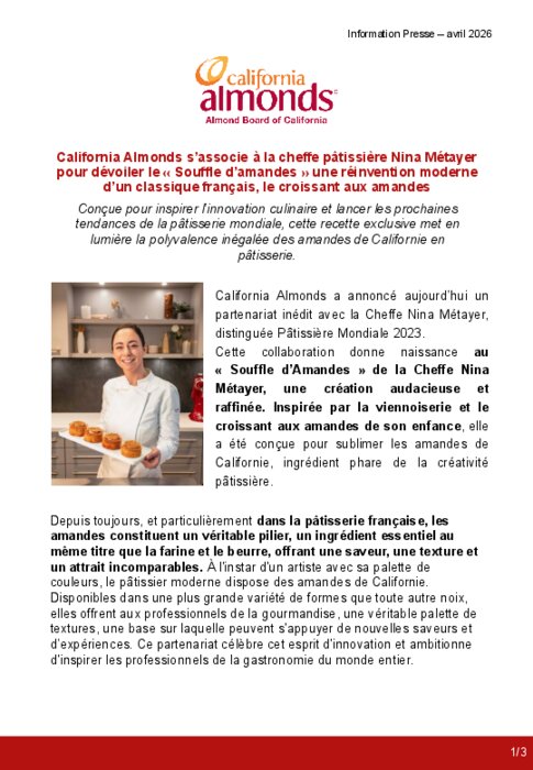 California Almonds s’associe à la cheffe pâtissière Nina Métayer pour dévoiler le « Souffle d’amandes » une réinvention moderne d’un classique français, le croissant aux amandes.