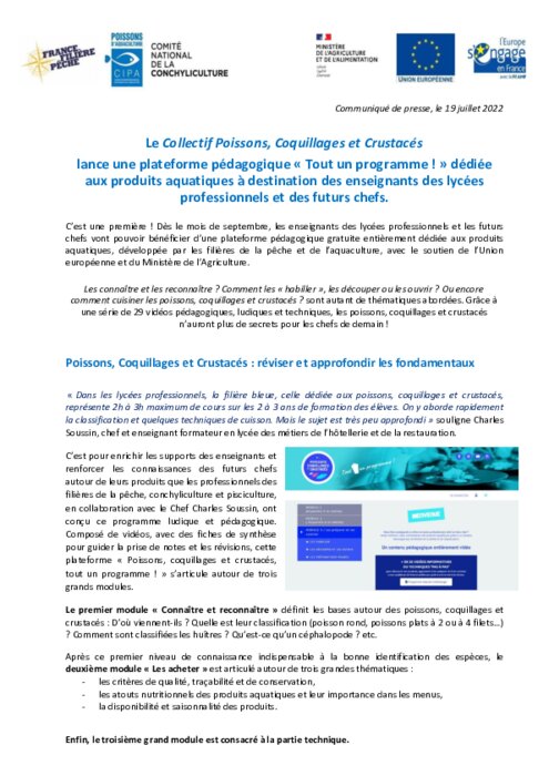 Dès le mois de septembre, les enseignants des lycées professionnels et les futurs chefs vont pouvoir bénéficier d’une plateforme pédagogique gratuite entièrement dédiée aux produits aquatiques, développée par les filières de la pêche et de l’aquaculture, avec le soutien de l’Union européenne et du Ministère de l’Agriculture.