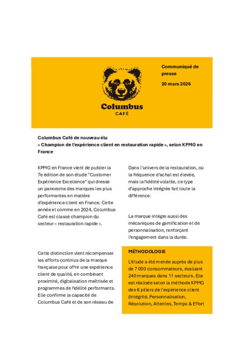 KPMG en France vient de publier la 7e édition de son étude "Customer Expérience Excellence" qui dresse un panorama des marques les plus performantes en matière d’expérience client en France. Cette année et comme en 2024, Columbus Café est classé champion du secteur « restauration rapide ».
