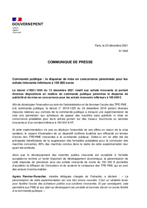 Afin de développer l’innovation au sein de l’administration et de favoriser l’accès des TPE-PME à la commande publique, le décret n° 2018-1225 du 24 décembre 2018 portant diverses mesures relatives aux contrats de la commande publique a instauré une expérimentation de trois ans permettant aux acheteurs de passer des marchés sans publicité ni mise en concurrence préalables pour leurs achats portant sur des travaux, fournitures ou services innovants et d’un montant inférieur à 100 000 € HT.
