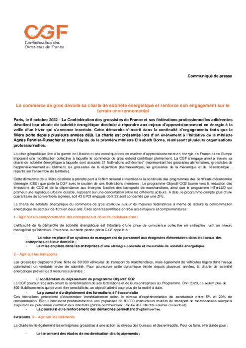 Métiers 06 octobre 2022 - 16:01 La Confédération des grossistes de France et ses fédérations professionnelles adhérentes dévoilent leur charte de sobriété énergétique destinée à répondre aux enjeux d’approvisionnement en énergie à la veille d’un hiver qui s’annonce incertain. PDF (153 Ko) Télécharger