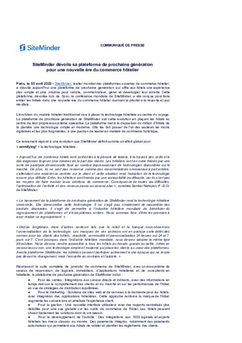 SiteMinder, leader mondial des plateformes ouvertes de commerce hôtelier, a dévoilé aujourd’hui une plateforme de prochaine génération qui offre aux hôtels une expérience plus simple et plus intuitive pour vendre, commercialiser, gérer et développer leur activité. Cette plateforme, dévoilée lors de Sync, la conférence mondiale de SiteMinder, a été conçue pour faire entrer les hôtels dans une nouvelle ère du commerce hôtelier donnant la priorité à la réussite et aux résultats.