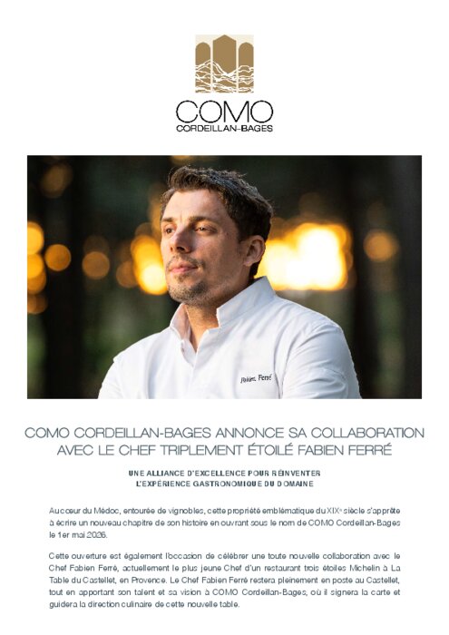 Restauration commerciale 13 mars 2026 - 16:28 Au cœur du Médoc, entourée de vignobles, cette propriété emblématique du XIXe siècle s’apprête à écrire un nouveau chapitre de son histoire en ouvrant sous le nom de Como Cordeillan-Bages le 1er mai. PDF (3 Mo) Télécharger