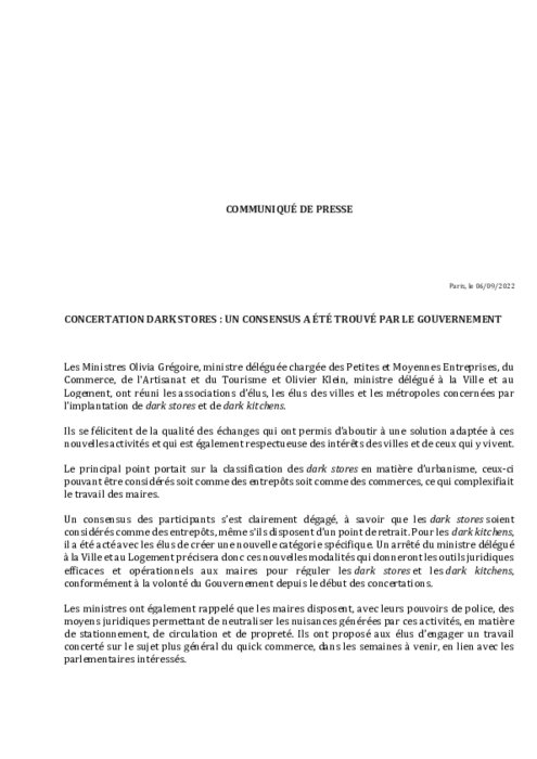 Les Ministres Olivia Grégoire, ministre déléguée chargée des Petites et Moyennes Entreprises, du Commerce, de l'Artisanat et du Tourisme et Olivier Klein, ministre délégué à la Ville et au Logement, ont réuni les associations d’élus, les élus des villes et les métropoles concernées par l’implantation de dark stores et de dark kitchens.
