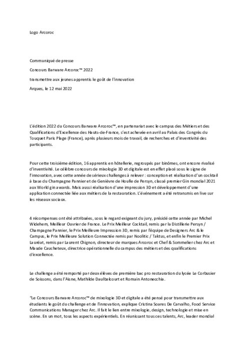 L’édition 2022 du Concours Barware Arcoroc, en partenariat avec le campus des Métiers et des Qualifications d’Excellence des Hauts-de-France, s’est achevée en avril au Palais des Congrès du Touquet Paris Plage (France), après plusieurs mois de travail, de recherches et d'inventivité des participants.
