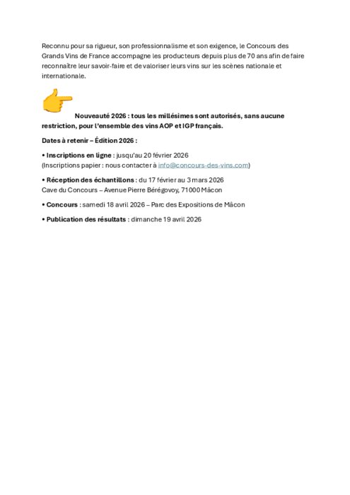 Reconnu pour sa rigueur, son professionnalisme et son exigence, le Concours des Grands Vins de France accompagne les producteurs depuis plus de 70 ans afin de faire reconnaître leur savoir-faire et de valoriser leurs vins sur les scènes nationale et internationale.