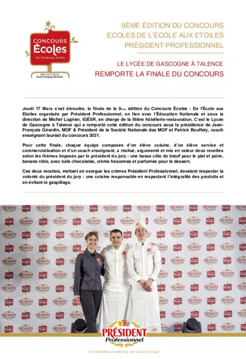 Métiers 18 mars 2022 - 18:04 Pour cette finale, chaque équipe composée d’un élève cuisine, d’un élève service et commercialisation et d’un coach enseignant, a réalisé, argumenté et mis en valeur deux recettes selon les thèmes imposés par le président du jury . PDF (622 Ko) Télécharger