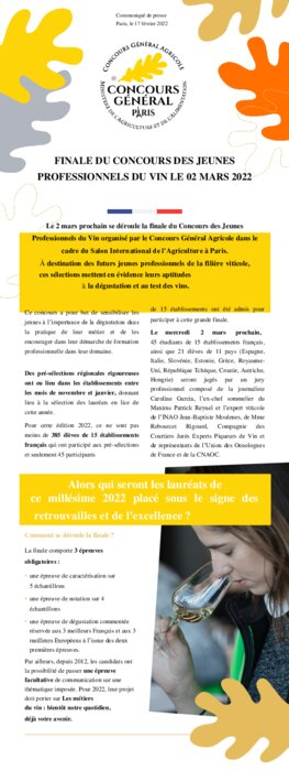 Métiers 22 février 2022 - 09:57 Le 2 mars prochain se déroule la finale du Concours des Jeunes Professionnels du Vin organisé par le Concours Général Agricole dans le cadre du Salon International de l’Agriculture à Paris. PDF (466 Ko) Télécharger