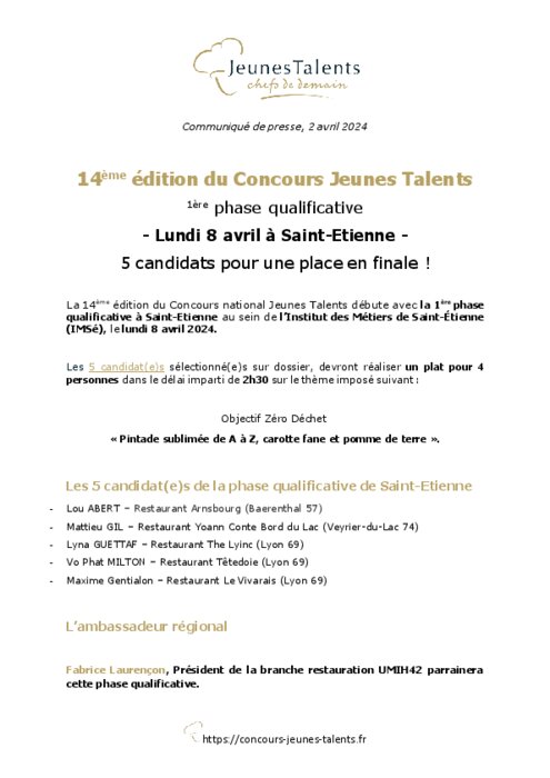 Fondé par Peggy Perrey, le Concours Jeunes Talents a été créé afin de mettre en lumière les jeunes désireux de s’investir et de progresser dans le secteur de la restauration. Les inscriptions sont ouvertes aux apprentis et jeunes cuisiniers (-26ans) en apprentissage ou en poste chez un restaurateur proposant une cuisine « 100% Fait Maison, basée sur le savoir-faire et la transmission ».