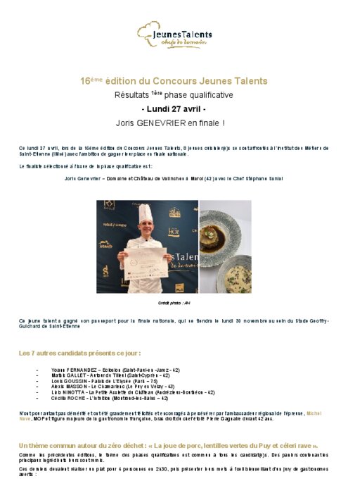 Métiers 28 avril 2026 - 09:12 Le lundi 27 avril, lors de la 16e édition du Concours Jeunes Talents, 8 jeunes cuisinier(e)s se sont affrontés à l’Institut des Métiers de Saint-Etienne (IMsé) avec l’ambition de gagner leur place en finale nationale. PDF (248 Ko) Télécharger Crédit photo : AH