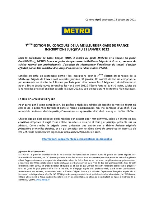 Métiers 14 décembre 2021 - 14:23 Sous la présidence de Gilles Goujon (MOF, 3 étoiles au guide Michelin et 5 toques au guide Gault&Millau), METRO France organise chaque année la Meilleure Brigade de France, concours de cuisine réservé aux professionnels. PDF (212 Ko) Télécharger