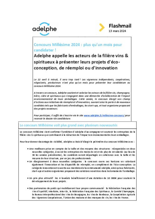 A travers ce concours, Adelphe soutient et valorise les acteurs de la filière vin, champagne, bière, cidre et spiritueux qui s’engagent dans une démarche d’amélioration de l’impact environnemental de leurs emballages. Cette année, le concours élargit son champ d’actions aux initiatives de réemploi et d'innovation, ouvrant ainsi la porte à de nouveaux candidats tels que les fabricants d'emballages, les start-ups, et tout organisme proposant des projets novateurs.