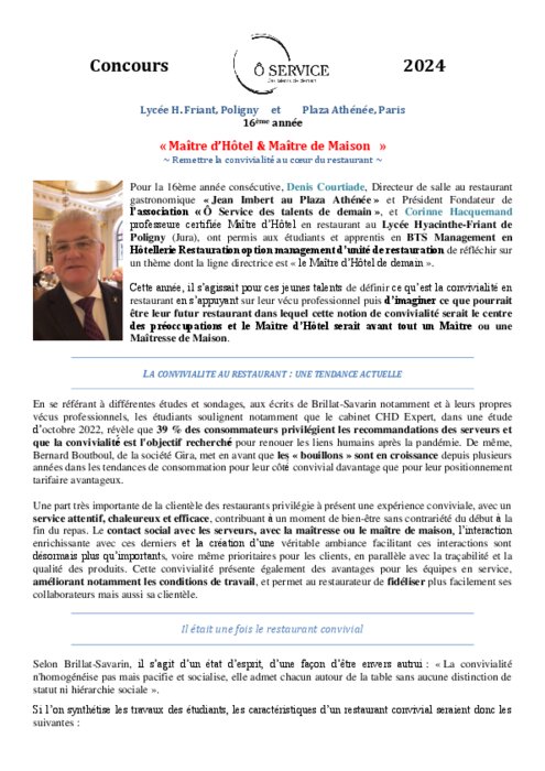 Pour la 16ème année consécutive, Denis Courtiade, Directeur de salle au restaurant gastronomique « Jean Imbert au Plaza Athénée » et Président Fondateur de l’association « Ô Service des talents de demain », et Corinne Hacquemand professeure certifiée Maître d’Hôtel en restaurant au Lycée Hyacinthe-Friant de Poligny (Jura), ont permis aux étudiants et apprentis en BTS Management en Hôtellerie Restauration option management d’unité de restauration de réfléchir sur un thème dont la ligne directrice est « le Maître d’Hôtel de demain ».