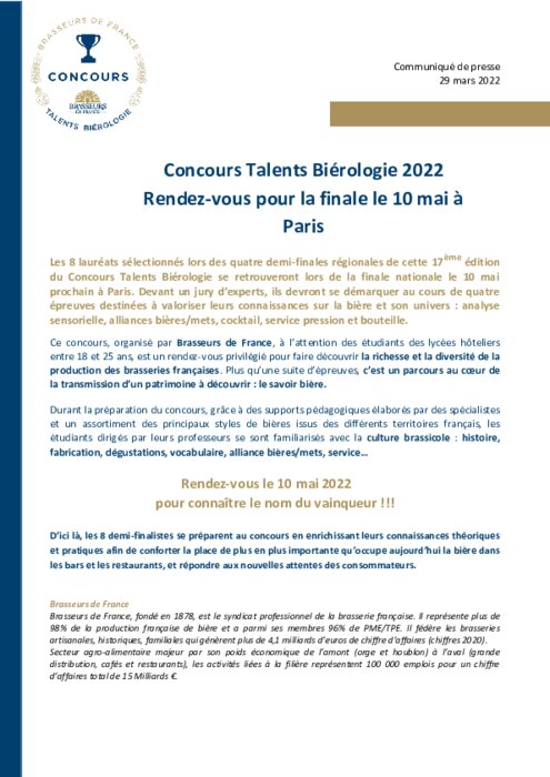 Métiers 29 mars 2022 - 15:09 Les 8 lauréats sélectionnés lors des quatre demi-finales régionales de cette 17ème édition du Concours Talents Biérologie se retrouveront lors de la finale nationale le 10 mai prochain à Paris. PDF (333 Ko) Télécharger