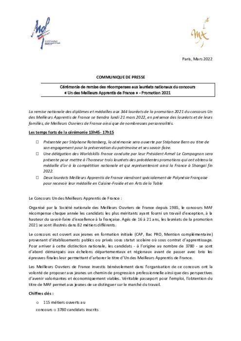 Organisé par la Société nationale des Meilleurs Ouvriers de France depuis 1985, le concours MAF récompense chaque année les candidats les plus méritants ayant fourni un travail d’exception, à la hauteur du savoir-faire d’excellence à la française. Agés de 16 à 21 ans, les lauréats de la promotion 2021 se sont illustrés dans 82 métiers différents.