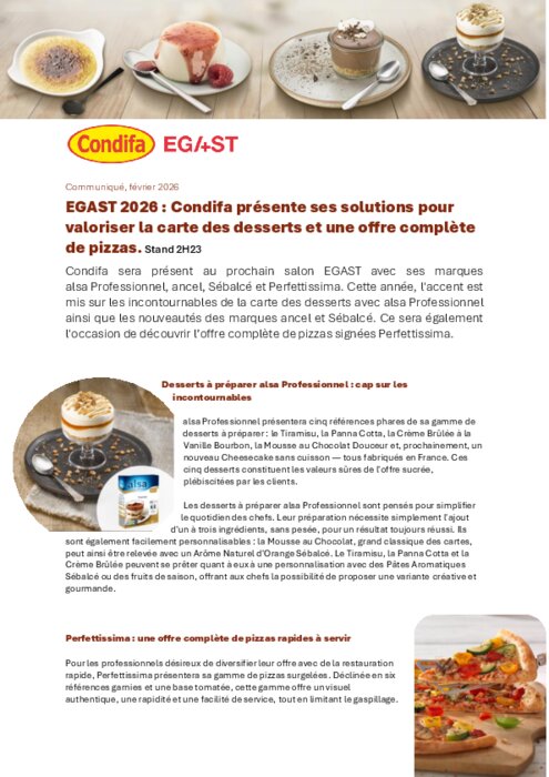 Condifa sera présent au prochain salon Egast avec ses marques alsa Professionnel, ancel, Sébalcé et Perfettissima. Cette année, l'accent est mis sur les incontournables de la carte des desserts avec alsa Professionnel ainsi que les nouveautés des marques ancel et Sébalcé. Ce sera également l'occasion de découvrir l’offre complète de pizzas signées Perfettissima.