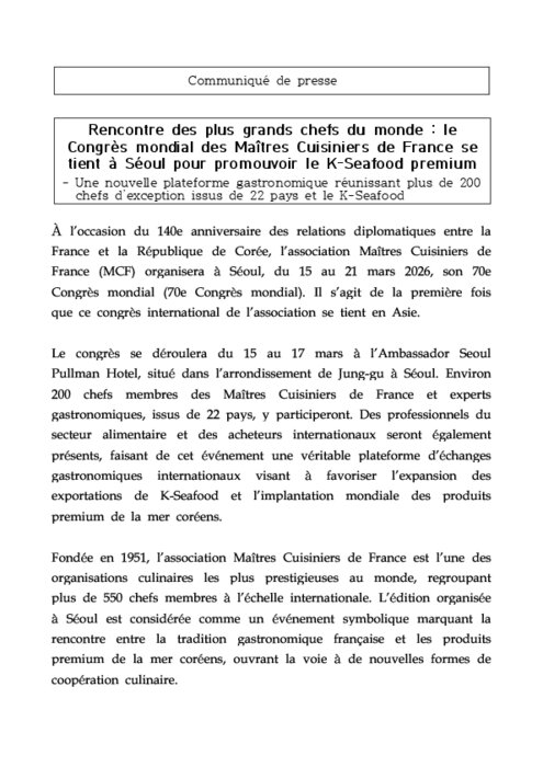 Métiers 12 mars 2026 - 14:41 Pour la première fois de son histoire, le Congrès mondial des Maîtres Cuisiniers de France se tiendra en Asie, à Séoul, du 15 au 17 mars, réunissant plus de 200 chefs et experts gastronomiques issus de 22 pays. PDF (54 Ko) Télécharger credit MCF