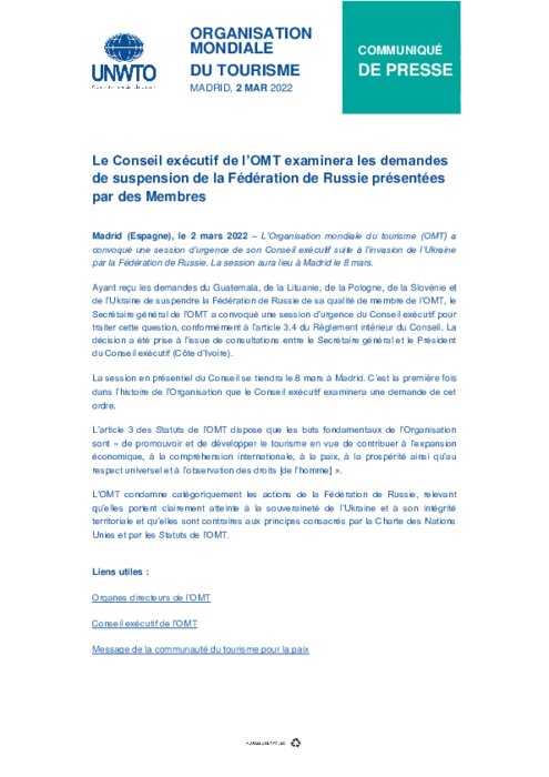 Ayant reçu les demandes du Guatemala, de la Lituanie, de la Pologne, de la Slovénie et de l’Ukraine de suspendre la Fédération de Russie de sa qualité de membre de l’OMT, le Secrétaire général de l’OMT a convoqué une session d’urgence du Conseil exécutif pour traiter cette question, conformément à l’article 3.4 du Règlement intérieur du Conseil.
