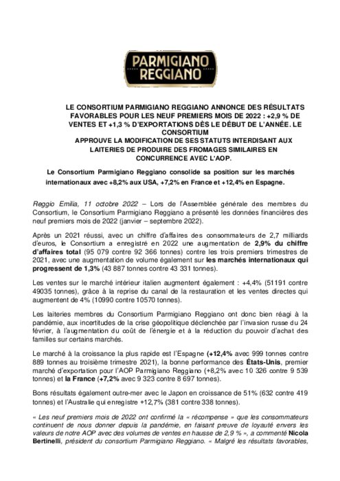 Le consortium Parmigiano Reggiano annonce des résultats favorables