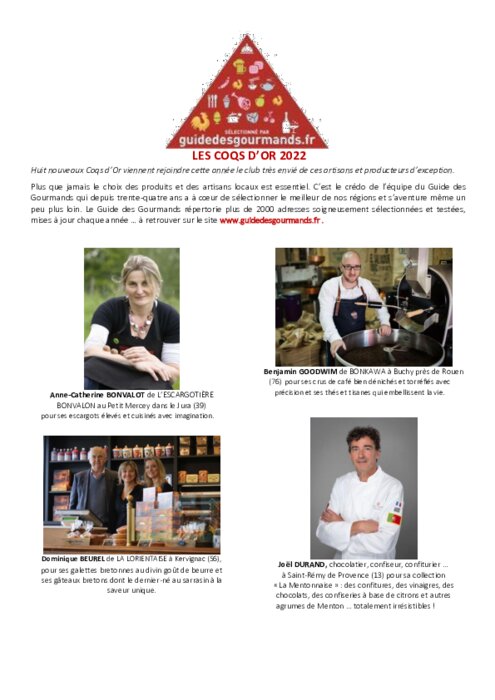 Métiers 19 octobre 2021 - 02:47 Comme chaque année le Guide des Gourmands a sélectionné des artisans et producteurs d’exception. Ce sont les nouveaux Coqs d’Or et ils sont au nombre de huit cette année. PDF (606 Ko) Télécharger