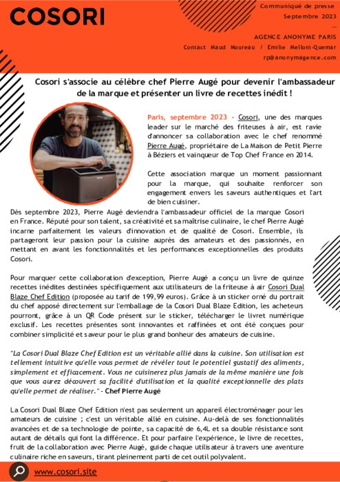 Fournisseurs 06 septembre 2023 - 18:47 Cette association marque un moment passionnant pour la marque, qui souhaite renforcer son engagement envers les saveurs authentiques et l'art de bien cuisiner. PDF (326 Ko) Télécharger
