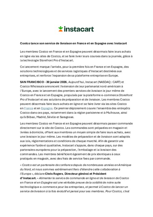 Ce lancement marque l’arrivée, pour la première fois en France et en Espagne, des solutions technologiques et de services logistiques d’Instacart destinées aux entreprises, et renforce l’expansion de sa plateforme entreprise en Europe.