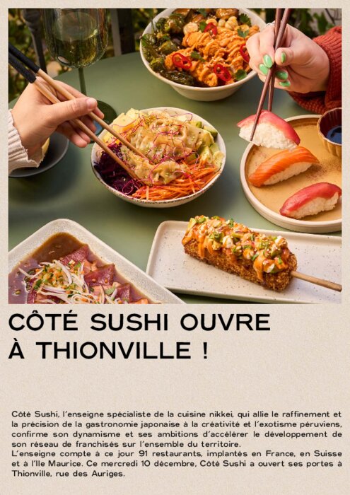 Côté Sushi, l’enseigne spécialiste de la cuisine nikkei, qui allie le raffinement et la précision de la gastronomie japonaise à la créativité et l’exotisme péruviens, confirme son dynamisme et ses ambitions d’accélérer le développement de son réseau de franchisés sur l’ensemble du territoire. L’enseigne compte à ce jour 91 restaurants, implantés en France, en Suisse et à l’Ile Maurice. Ce mercredi 10 décembre, Côté Sushi a ouvert ses portes à Thionville, rue des Auriges.