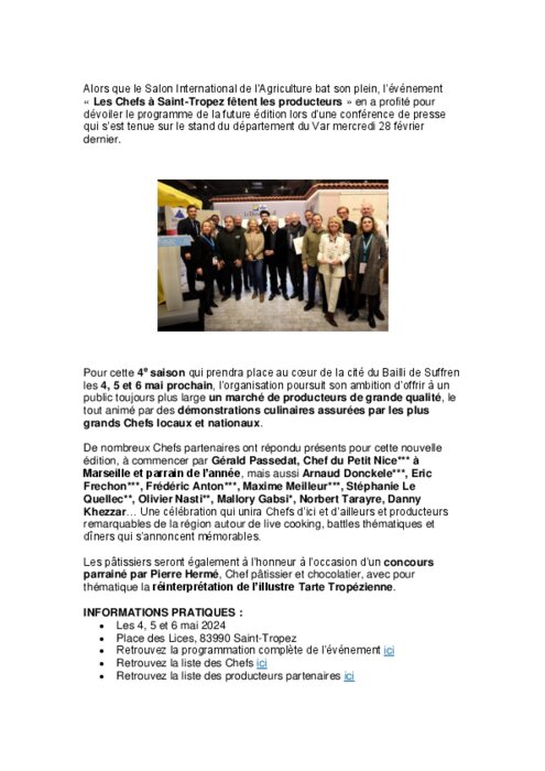 L’événement « Les Chefs à Saint-Tropez fêtent les producteurs » a dévoilé le programme de la future édition lors d’une conférence de presse qui s’est tenue sur le stand du département du Var mercredi 28 février. Les pâtissiers seront également à l’honneur à l’occasion d’un concours parrainé par Pierre Hermé, Chef pâtissier et chocolatier, avec pour thématique la réinterprétation de l’illustre Tarte Tropézienne.