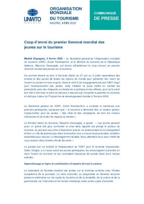Le Secrétaire général de l'Organisation mondiale du tourisme (OMT), Zurab Pololikashvili, et le Ministre du tourisme de la République italienne, Massimo Garavaglia, ont donné officiellement le coup d'envoi du premier Sommet mondial des jeunes sur le tourisme.